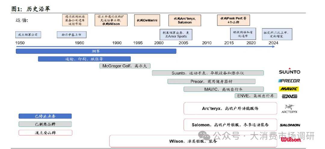 1977年于芬蘭赫爾辛基上市, 1984年于英國倫敦上市, 2019年 5月被安踏體育、方源資本、 Anamered Investments和騰訊組成的財(cái)團(tuán)(后文簡稱為 “財(cái)團(tuán) 全資收購 旨在通過改革商業(yè)模式 、 加大品牌投入 、 擴(kuò)大展業(yè)區(qū)域、發(fā)展多渠道戰(zhàn)略,私有化退市。收購后精簡品牌矩陣,剝離MAVIC 2019年)、 Precor 2021年)、 Suunto 2022年)、 ENVE 2024年)等品牌 聚焦核心品牌 Arc’teryx、 Salomon、 Wilson。 2024年 2月 1日在紐約股票交易所二次上市,同年 12月 6日完成 4080萬股定向增發(fā),募集資金主要用于償還債務(wù)。