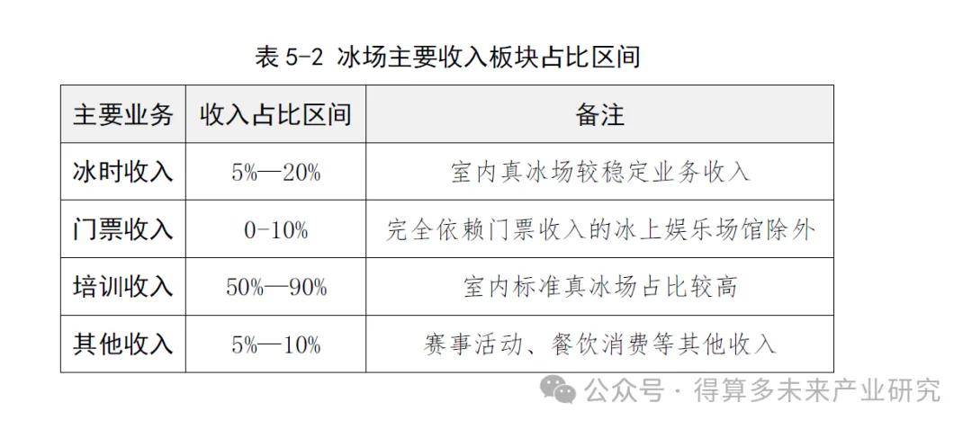 相比滑雪場(chǎng)業(yè)務(wù),滑冰場(chǎng)收入較為單一,主要包括門票、冰時(shí)租賃和培訓(xùn)等業(yè)務(wù)。由(表5-2)可以看出,培訓(xùn)業(yè)務(wù)是滑冰場(chǎng)最為倚重的收入來(lái)源,甚至占到部分冰場(chǎng)收入的九成以上。