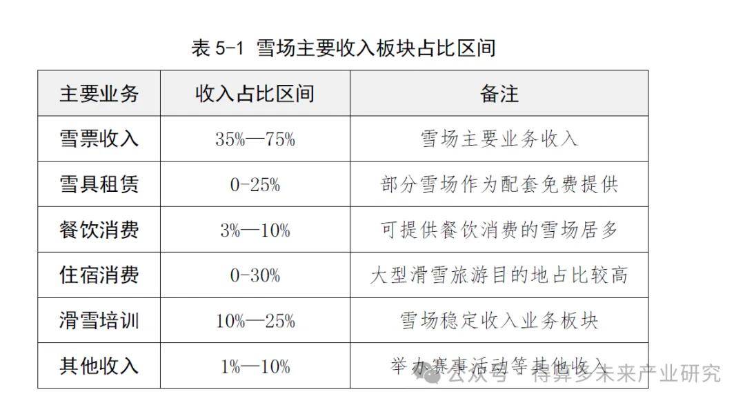 滑雪場(chǎng)主要收入包括雪票、餐飲、住宿等業(yè)務(wù)板塊。雪票銷售是滑雪場(chǎng)主要收入來(lái)源之一,尤其是部分位于城市之中或城市周邊、未配套建設(shè)住宿設(shè)施的雪場(chǎng)。另外有部分雪場(chǎng)的雪具租賃成本打包在雪票中,所以該部分雪場(chǎng)的雪具租賃僅作為配套提供。根據(jù)對(duì)部分具有代表性雪場(chǎng)的調(diào)查分析,雪場(chǎng)主要業(yè)務(wù)收入和各板塊占總收入之比的上下區(qū)間見(jiàn)
