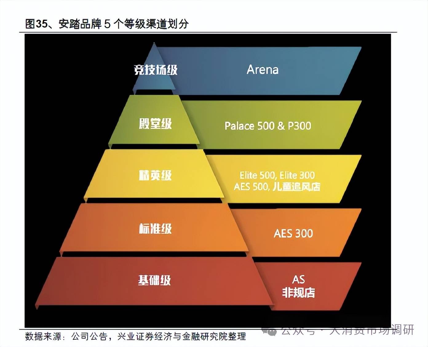 運(yùn)動產(chǎn)品同質(zhì)化的內(nèi)卷趨勢下,安踏邁出渠道分層的步伐。安踏主品牌拒絕千店一面,通過推出更豐富店態(tài),“不同人、不同場、不同貨”,以更精細(xì)化、差異化運(yùn)營的店型來突破單品牌的上限。安踏將常規(guī)門店重新梳理為5 個(gè)等級——競技場級、殿堂級、精英級、標(biāo)準(zhǔn)級、基礎(chǔ)級,并創(chuàng)新性的以品類品牌做垂類市場