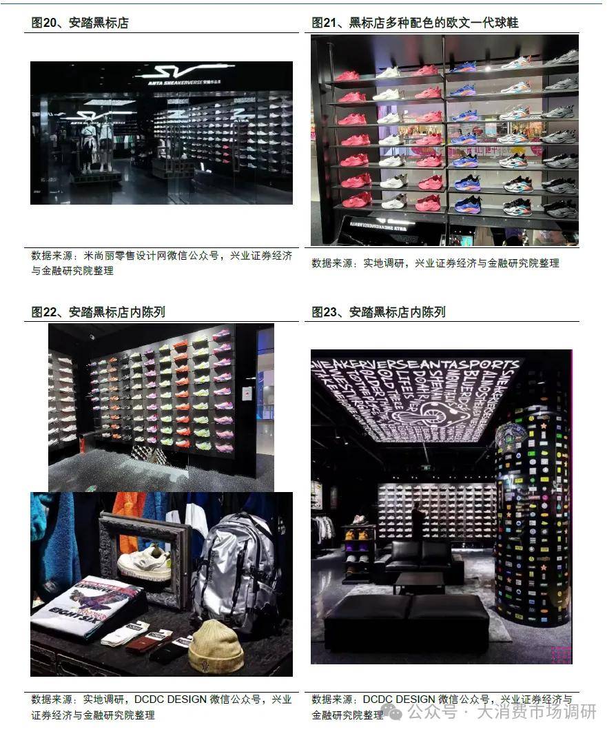 重重年輕潮流,嘻哈和街頭文化風(fēng)格更加突出。黑標(biāo)店門店以黑色為主基調(diào),相對于白標(biāo)店門店分布更廣,主要分布于萬達(dá)廣場、萬象城系中高端商圈。黑標(biāo)店的核心產(chǎn)品包括獨(dú)家款式和不同配色的歐文系列球鞋,還包括高端系列戶外跑鞋,以科技和競技產(chǎn)品居多,如馬赫4 代氮科技跑鞋;冠軍系列,如冠軍獵隼、冠軍乘風(fēng)越野跑鞋、奧運(yùn)冠軍領(lǐng)獎(jiǎng)鞋;休閑鞋,如冠軍G01 休閑鞋、泡泡瑪特聯(lián)名休閑鞋、驁杰S 板鞋等。