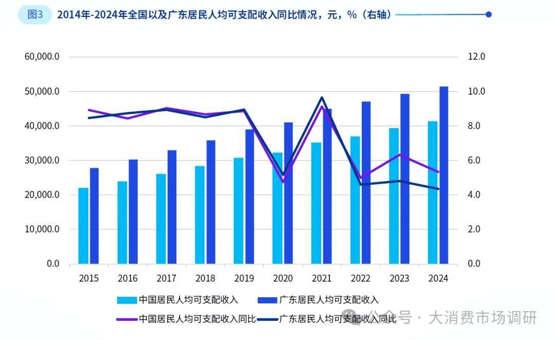 隨著中國經(jīng)濟的回升向好,就業(yè)形勢總體改善,居民收入實現(xiàn)與經(jīng)濟增長同步。2024年,全國居民人均可支配收入首次突破四萬元大關(guān),達到4.1萬元,比2023年增長5.3%,扣除價格因素,實際增長5.1%,略高于GDP增速。廣東方面,2024年廣東人均可支配收入首次突破五萬元,達到5.1萬元,高于全國平均水平,同比增長4.4%,為提振消費及經(jīng)濟活力的持續(xù)釋放奠定了堅實基礎(chǔ)。