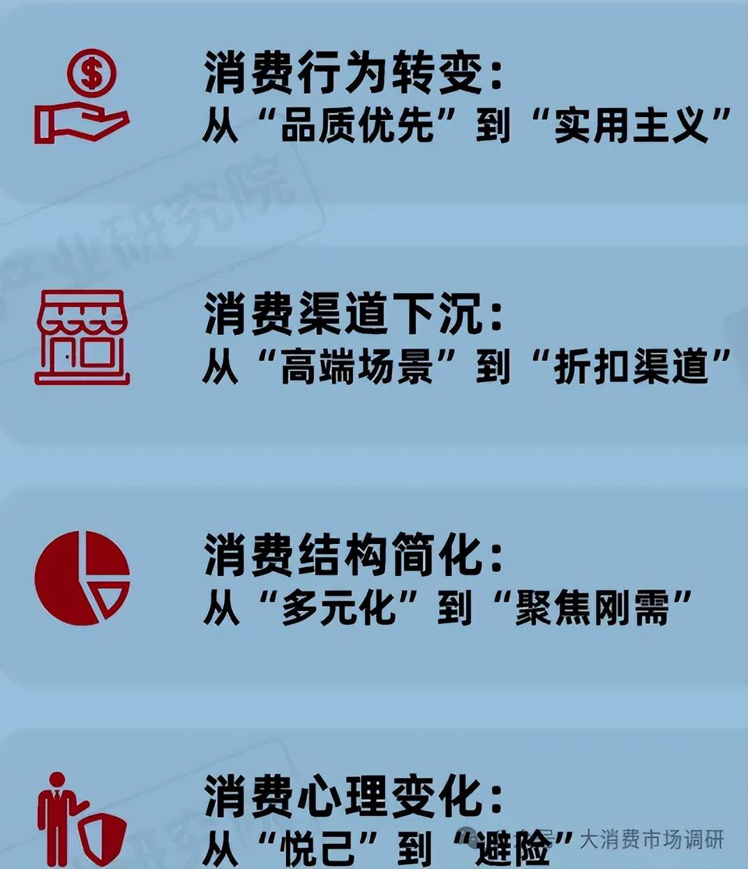 當(dāng)前消費(fèi)模式呈現(xiàn)出明顯的降級(jí)特征。如消費(fèi)行為從追求品質(zhì)轉(zhuǎn)為實(shí)用,渠道從高端場(chǎng)景下沉至折扣渠道,結(jié)構(gòu)從多元聚焦剛需,心理從注重悅己變?yōu)楸茈U(xiǎn),反映出市場(chǎng)消費(fèi)的整體轉(zhuǎn)變。
