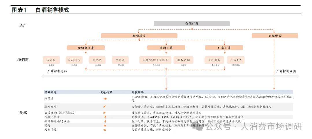 渠道作為連接廠家與消費(fèi)者的重要橋梁,在白酒發(fā)展過(guò)程中至關(guān)重要。建國(guó)以來(lái),白酒渠道經(jīng)歷國(guó)家統(tǒng)購(gòu)統(tǒng)銷(xiāo)、國(guó)營(yíng)糖酒公司主導(dǎo)、大流通時(shí)代民營(yíng)大商快速 崛起、消費(fèi)者主導(dǎo)下終端致勝等多階段后,目前已形成經(jīng)銷(xiāo)為主、直銷(xiāo)為輔的銷(xiāo)售結(jié)構(gòu)。在經(jīng)銷(xiāo)模式中,根據(jù)廠家主導(dǎo)力不同,可以分為“廠家主導(dǎo)”、“經(jīng)銷(xiāo)商主導(dǎo)”和“合作共贏”三大類(lèi),行業(yè)渠道復(fù)合式發(fā)展。終端實(shí)現(xiàn)多元化發(fā)展,消費(fèi)者可以通過(guò)煙酒店、酒店宴請(qǐng)、團(tuán)購(gòu)、互聯(lián)網(wǎng)等多種渠道購(gòu)買(mǎi)白酒。每種渠道模式各有優(yōu)劣,酒廠根據(jù)自身的發(fā)展階段靈活選擇,整體呈現(xiàn)出線上化、數(shù)字化、精細(xì)化三大趨勢(shì)。