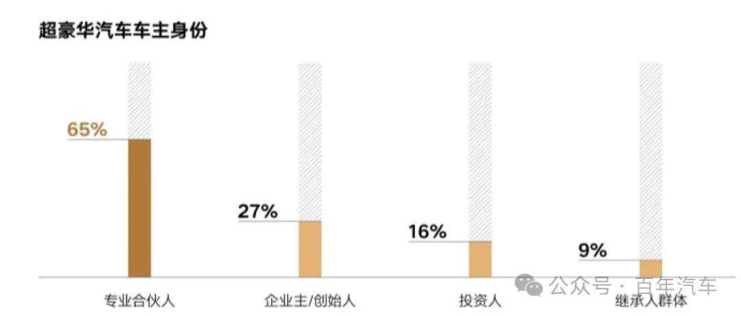 在身份構(gòu)成上,超豪華汽車(chē)消費(fèi)者呈現(xiàn)出明顯的職業(yè)精英化特征:專(zhuān)業(yè)合伙人占比達(dá)到65%、企業(yè)主/創(chuàng)始人緊隨其后,占比27%,投資人占比16%,繼承人群體占比為9%。
