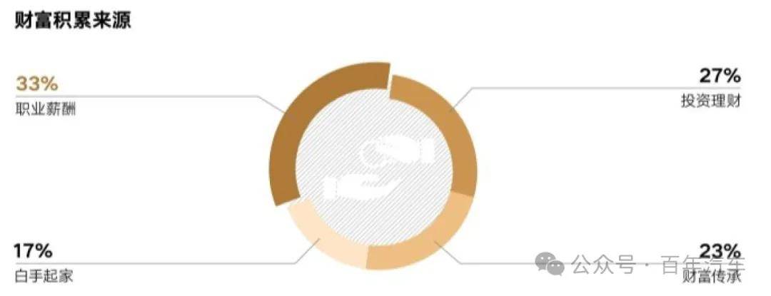 超豪華汽車(chē)消費(fèi)者的財(cái)富積累來(lái)源分布較為均衡,職業(yè)新酬和投資理財(cái)是相對(duì)典型的財(cái)富來(lái)源,分別占比33%和27%。