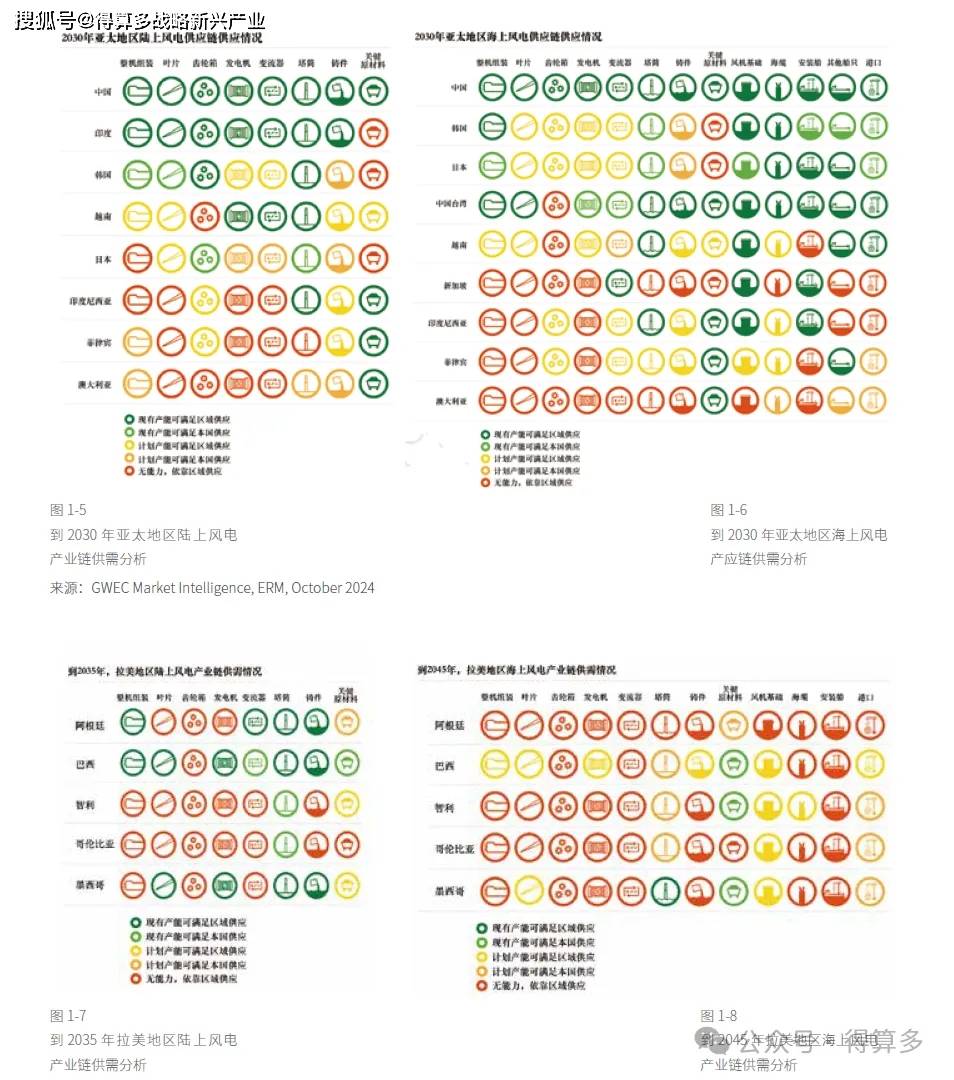 風(fēng)電產(chǎn)業(yè)鏈的大部分供應(yīng)商仍位于亞太地區(qū)歐洲和美洲地區(qū),中東和北非地區(qū)也出現(xiàn)了新的供應(yīng)商。從區(qū)域上看,亞太地區(qū)是世界第一大風(fēng)電機組裝配和關(guān)鍵零部件生產(chǎn)中心,陸上產(chǎn)能主要分布在中國和印度,到 2030 年除中國外的其他國家供應(yīng)將面臨瓶頸,海上產(chǎn)能除中國外,到2030年其他國家市場都將面臨瓶頸。歐洲是第二大世界風(fēng)電機組裝配生產(chǎn)基地,在2030年后歐洲目前的產(chǎn)能不足以支撐未來的需求。拉美地區(qū)陸上產(chǎn)業(yè)鏈雖有一定基礎(chǔ),但在 2029 年后全產(chǎn)業(yè)鏈面臨瓶頸,海上風(fēng)電產(chǎn)業(yè)鏈目前幾乎處于空白,直到2045 年都將面臨瓶頸。
