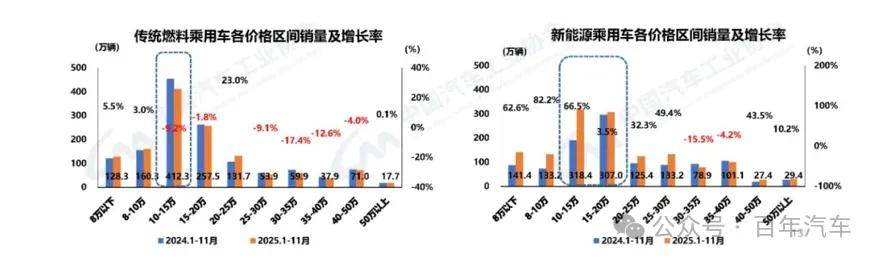 1-11月,傳統(tǒng)燃料乘用車中,銷量主要集中在10-15萬價(jià)格區(qū)間,累計(jì)銷量412.3萬輛,同比下降9.2%