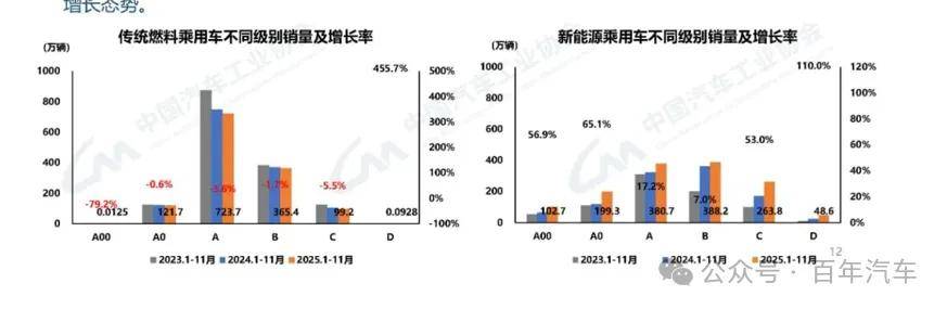 1-11月,傳統(tǒng)燃料乘用車中,A00級(jí)~C級(jí)銷量均呈不同程度下降。目前銷量仍主要集中在A級(jí),累計(jì)銷量723.7萬輛,同比下降3.6%。