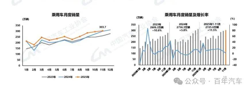 1-11月,乘用車產(chǎn)銷分別完成2738.8萬輛和2725.6萬輛,同比分別增長(zhǎng)12%和11.5%。