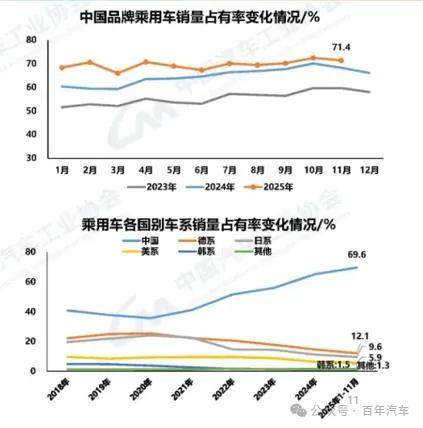 中國品牌乘用車(11月)銷量:216.9萬輛,同比增長(zhǎng)5.8%銷量占有率:71.4%,較去年同期上升3.1個(gè)百分點(diǎn)