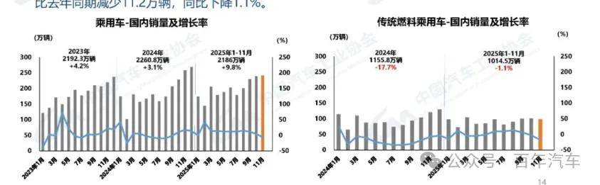 1-11月,乘用車國內(nèi)銷量2186萬輛,同比增長(zhǎng)9.8%。其中,傳統(tǒng)燃料乘用車國內(nèi)銷量1014.5萬輛比去年同期減少11.2萬輛,同比下降1.1%。
