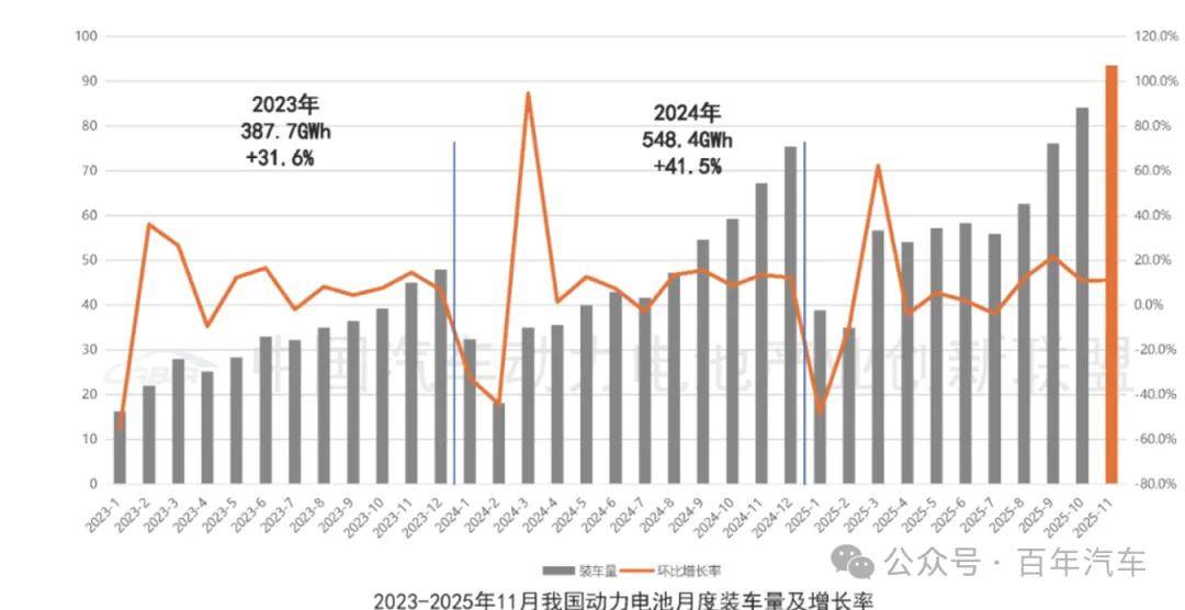11月,國內(nèi)動(dòng)力電池裝車量93.5GWh,環(huán)比增長11.2%,同比增長39.2%。其中三元電池裝車量18.2GWh,占總裝車量19.4%,環(huán)比增長9.9%,同比增長33.7%;磷酸鐵鋰電池裝車量75.3GWh,占總裝車量80.5%,環(huán)比增長11.6%,同比增長40.7%。