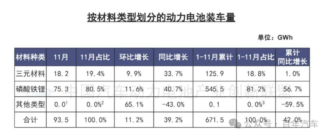 1-11月,國內(nèi)動(dòng)力電池累計(jì)裝車量671.5GWh,累計(jì)同比增長42.0%。其中三元電池累計(jì)裝車量125.9GWh,占總裝車量18.8%,累計(jì)同比增長1.0%;磷酸鐵鋰電池累計(jì)裝車量545.5GWh,占總裝車量81.2%,累計(jì)同比增長56.7%。