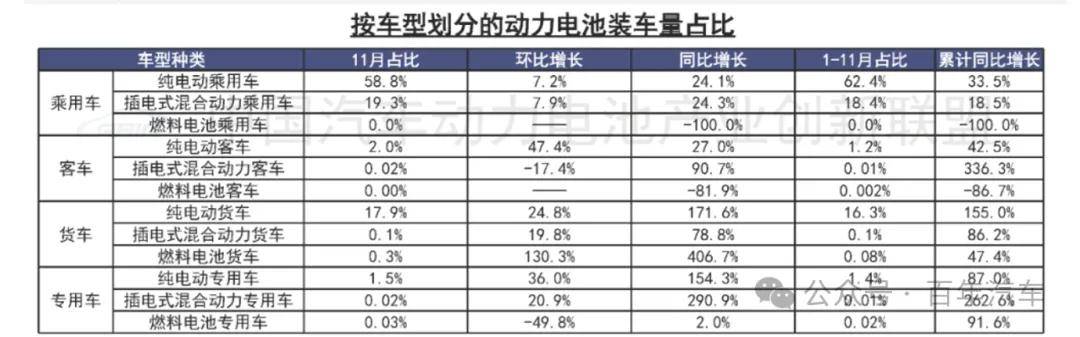 1-11月,純電動(dòng)汽車裝車量占比81.3%,累計(jì)同比增長48.6%;插電式混合動(dòng)力汽車裝車量占比18.6%,累計(jì)同比增長18.9%;燃料電池汽車裝車量占比0.1%,累計(jì)同比增長28.3%。其中,貨車和專用車增速較快。