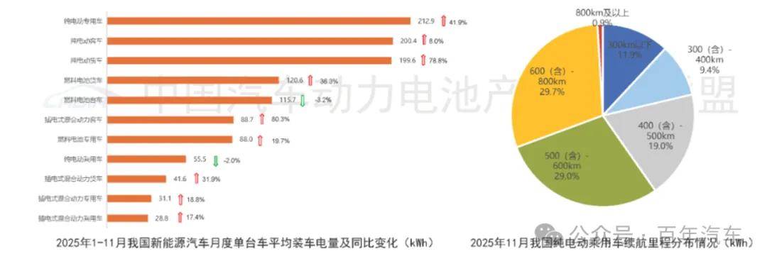 11月,我國新能源汽車單車平均帶電量58.5kWh,環(huán)比增長6.2%,純電動(dòng)乘用車和插電式混合動(dòng)力乘用車單車平均帶電量分別為58.1kWh和32.2kwh,環(huán)比分別增長1.5%和7.2%。1-11月,我國新能源汽車單車平均帶電量53.7kWh,同比增長16.5%。新能源乘用車、貨車、客車、專用車單車平均帶電量分別為45.8kWh、193.1kWh、197.5kWh和198.0kWh。
