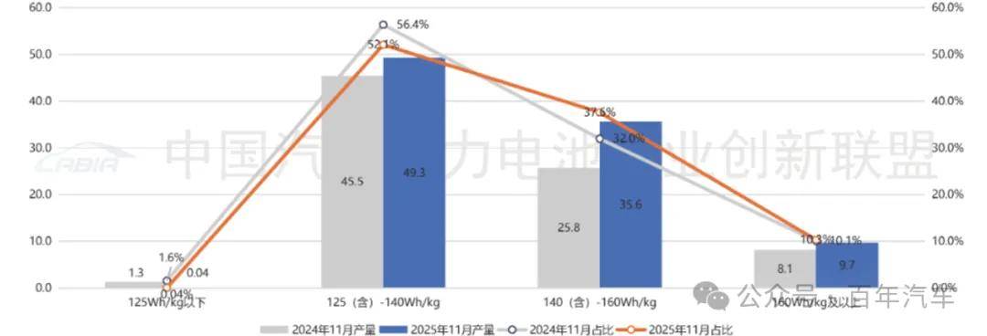 11月,我國純電動(dòng)乘用車系統(tǒng)能量密度在125Wh/kg以下、125(含)-140Wh/kg、140(含)-160Wh/kg和160Wh/kg及以上車型產(chǎn)量分別為0.04萬輛、49.3萬輛、35.6萬輛和9.7萬輛,占比分別0.04%、52.1%、37.6%和10.3%。