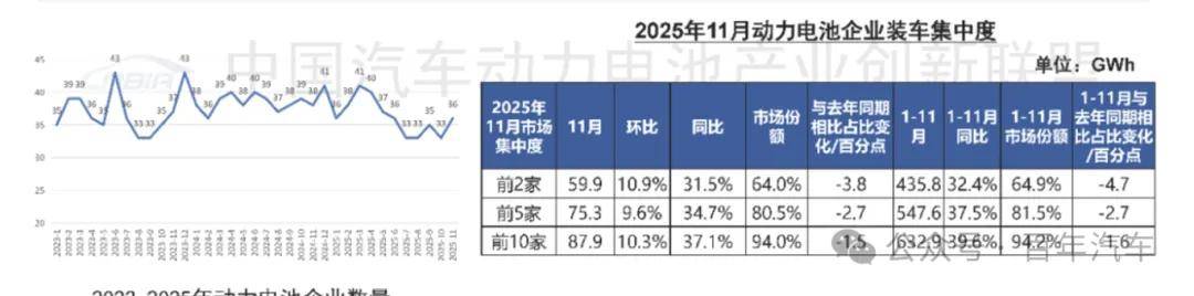 11月,我國新能源汽車市場(chǎng)共計(jì)36家動(dòng)力電池企業(yè)實(shí)現(xiàn)裝車配套,較去年同期減少2家排名前2家、前5家、前10家動(dòng)力電池企業(yè)動(dòng)力電池裝車量分別為59.9GWh、75.3GWh和87.9GWh,占總裝車量比分別為64.0%、80.5%和94.0%,前10家占比較去年同期減少1.5個(gè)百分點(diǎn)。1-11月,我國新能源汽車市場(chǎng)共計(jì)51家動(dòng)力電池企業(yè)實(shí)現(xiàn)裝車配套,和去年同期持平排名前2家、前5家、前10家動(dòng)力電池企業(yè)動(dòng)力電池裝車量分別為435.8GWh、547.6GWH和632.9GWh,占總裝車量比分別為64.9%、81.5%和94.2%,前10家占比較去年同期減少1.6個(gè)百分點(diǎn)。
