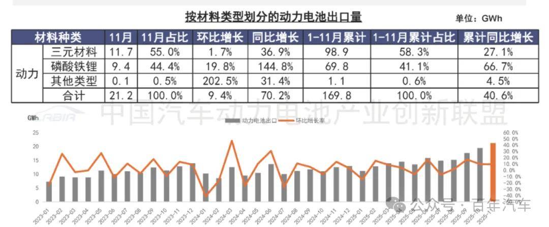 1-11月,我國(guó)動(dòng)力電池累計(jì)出口為169.8GWh,累計(jì)同比增長(zhǎng)40.6%。