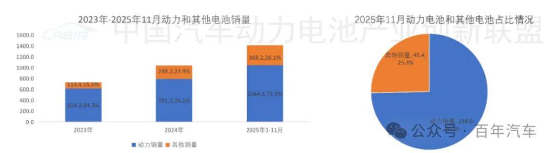 1-11月,我國(guó)動(dòng)力和其他電池累計(jì)銷(xiāo)量為1412.5GWh,累計(jì)同比增長(zhǎng)54.7%。動(dòng)力電池和其他電池銷(xiāo)量占比分別為73.9%和26.1%。與去年同期相比,其他電池占比提升2.2個(gè)百分點(diǎn)。