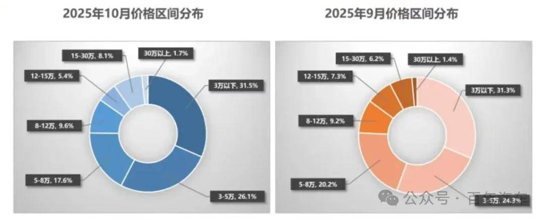 10月,二手車交易價格區(qū)間在3萬元以下的車輛市場占比最大,占31.5%,環(huán)比增長0.2個百分點,其次是3-5萬的車輛占26.1%環(huán)比增長1.8個百分點:5-8萬占17.6%,環(huán)比下降2.6個百分點;8-12萬區(qū)間較上月增長0.4個百分點;12-15萬區(qū)間較上下降1.8個百分點; 15-30萬和30萬以上兩個區(qū)間較上月分別增長了1.8個百分點和0.3個百分點。從價格分布上看,10月份,5萬元以內(nèi)以及15萬以上價格區(qū)間的占比較上月整體有所增加,中間價格區(qū)間的占比較上月有所減少。