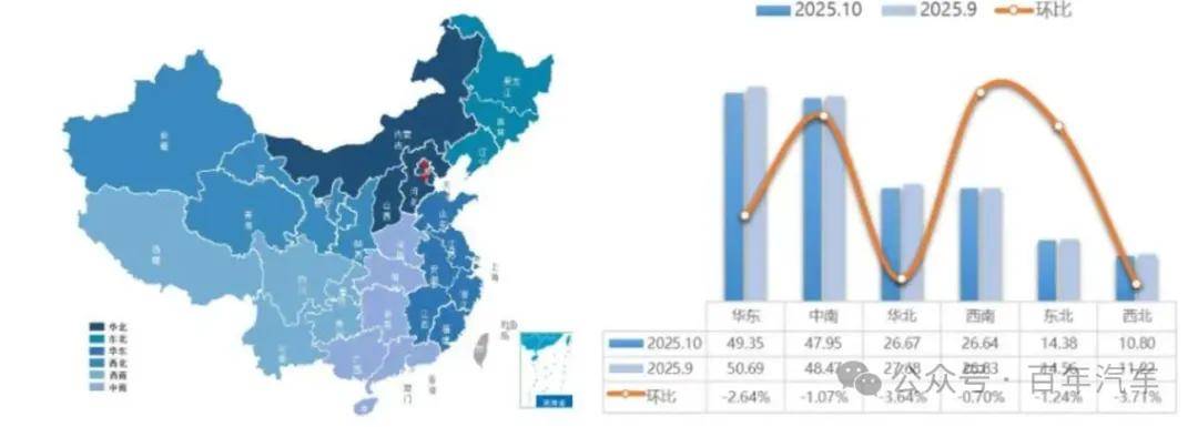 2025年10月,全國二手車市場交易量整體呈現(xiàn)小幅回落走勢。從六大區(qū)市場表現(xiàn)來看度的下滑。華北和西北地區(qū)降幅相對較為明顯。