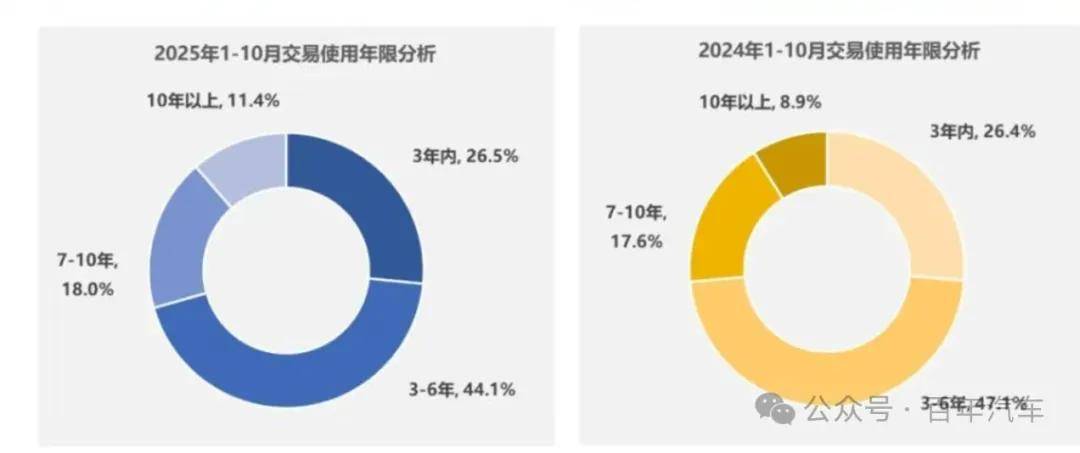 1-10月,二手車使用年限在3-6年的交易量最多,占比為44.1%,較去年同期下降3.1個百分點使用年限在3年內(nèi)車型占比為26.5%,較去年同期增加了0.2個百分點;車齡在7-10年的車型占比為18%,較去年同期增加了0.4個百分點;車齡10年以上的車型占比為11.4%,較去年同期增加了2.5個百分點,