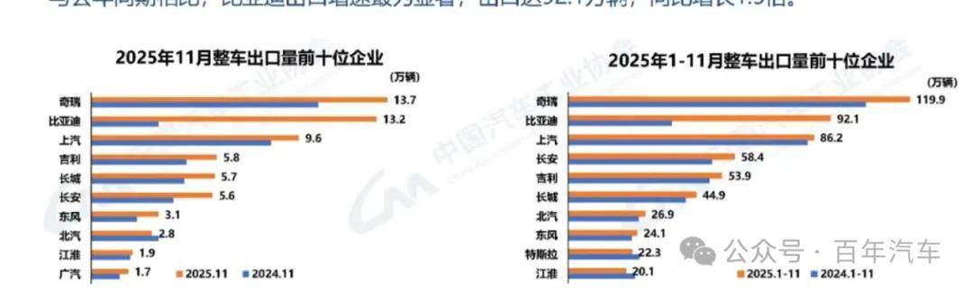11月,整車出口前十企業(yè)中,奇瑞出口量達13.7萬輛,同比增長30.3%,占總出口量的18.8%。與去年同期相比,比亞迪出口增速最為顯著,出口達13.2萬輛,同比增長3.3倍。1-11月,整車出口前十企業(yè)中,奇瑞出口量達119.9萬輛,同比增長14.7%,占總出口量的18.9%。與去年同期相比,比亞迪出口增速最為顯著,出口達92.1萬輛,同比增長1.5倍。