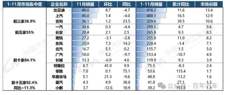 1-11月,新能源汽車銷量排名前十五位的集團銷量合計為1407.2萬輛,同比增長32.6%,占新能源汽車銷售總量的95.2%,高于去年同期1個百分點。