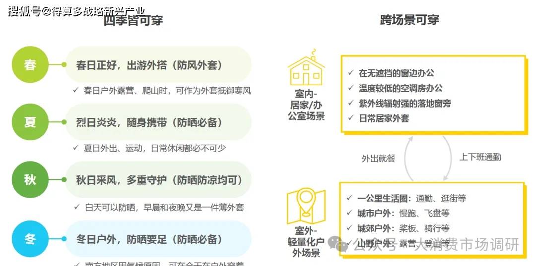 防曬衣的多功能性使其能夠滿足跨越不同季節(jié)和場(chǎng)景的需求。在炎炎夏日,防曬衣能夠提供有效的紫外線防護(hù),使人在戶外活動(dòng)時(shí)保持涼爽舒適;而處于亞熱帶/熱帶季風(fēng)氣候的南方,防曬衣在冬季同樣能夠?yàn)槠つw提供紫外線防護(hù)。在場(chǎng)景方面,防曬衣也因其功能性多、實(shí)用性強(qiáng)、時(shí)尚性高而與消費(fèi)者的生活有更強(qiáng)鏈接,甚至在跨越不同場(chǎng)景時(shí),也能成為消費(fèi)者理想的選擇。