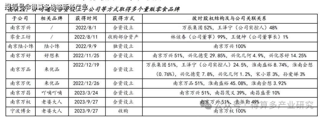 通過與原品牌團(tuán)隊合資設(shè)立子公司的方式,公司陸續(xù)將數(shù)個區(qū)域性零食量販品牌收入囊中,吸納豐富的行業(yè)經(jīng)驗:2022年11月,南京萬興與興化德雯等合資設(shè)立南京萬好,持股51%,再由南京萬好收購泰州好想來及其子公司部分資產(chǎn)(包括“好想來”系列商標(biāo)等),從而取得品牌“好想來”。2022年12月,公司及實控人王澤寧與淮南盛裕等合資設(shè)立南京萬品,公司/實控人分別持股51%/24.5%;由南京萬品與淮南盛裕合資設(shè)立南京萬優(yōu),前者持股51%,再由南京萬優(yōu)收購安徽盛亨食品等主體的部分資產(chǎn)(包括“來優(yōu)品”系列商標(biāo)等),從而取得品牌“來優(yōu)品”。2023年4月,南京萬興與南昌茂義等合資設(shè)立南京萬昌,持股51%,再由南京萬昌收購江西實啟供應(yīng)鏈有限公司等主體的部分資產(chǎn),取得品牌“吖丫嘀吖嘀”。2023年9月,南京萬興與袁振勤合資設(shè)立南京萬權(quán),持股51%;再由南京萬權(quán)以自有資金867.75萬元收購后者控股的寧波博全100%股權(quán)。