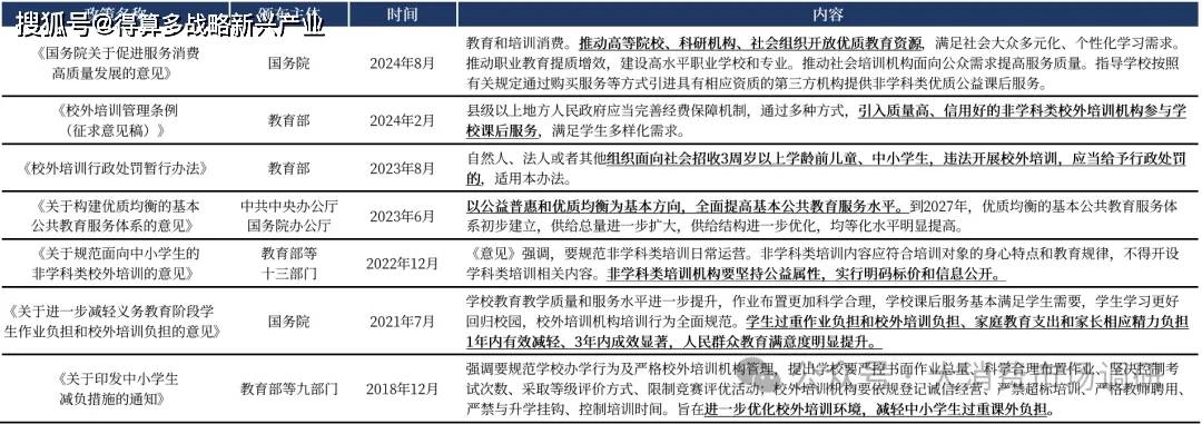 “雙減”之后,教育政策向公益普惠、優(yōu)質(zhì)均衡的非學科培訓傾斜。2023年6月,中共中央辦公廳、國務(wù)院辦公廳發(fā)布《關(guān)于構(gòu)建優(yōu)質(zhì)均衡的基本公共教育服務(wù)體系的意見》,強調(diào)以公益普惠和優(yōu)質(zhì)均衡為基本方向,全面提高基本公共教育服務(wù)水平,進一步擴大供給總量;2024年8月,《國務(wù)院關(guān)于促進服務(wù)消費高質(zhì)量發(fā)展的意見》中,提及推動高等院校、科研機構(gòu)、社會組織開放優(yōu)質(zhì)教育資源,指導學校按照有關(guān)規(guī)定引進第三方機構(gòu)提供非學科類優(yōu)質(zhì)公益課后服務(wù)。我們認為,“雙減”政策在加速教培行業(yè)出清后,政府后續(xù)配套政策著力加大公益性的優(yōu)質(zhì)教育資源服務(wù)供給,以此滿足社會多元化的教育需求,未來仍有望繼續(xù)出臺相關(guān)政策推動社會高效教育供給進校園、進課堂,惠及更多學生。