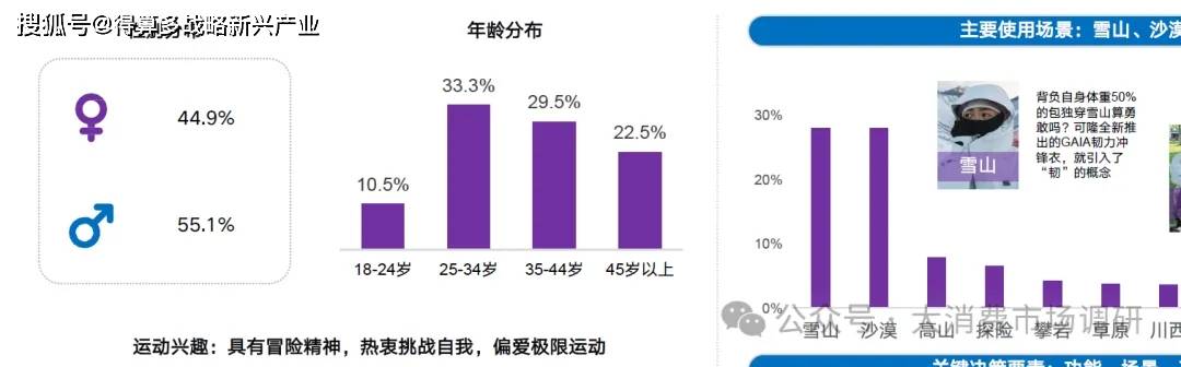 人群特征:熱愛戶外運(yùn)動(dòng)與自我挑戰(zhàn),專業(yè)功能、適用極限場(chǎng)景及科技工藝影響其沖鋒衣購(gòu)買決策