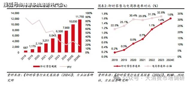 1.1 空間:24 年規(guī)模約 7800 億元,占社零比重為 1.6%,后續(xù)預(yù)計 20%+增速 即時零售 24 年規(guī)模約 7800 億元(同比+20%),當前滲透率為 1.6%。即時零售是指以即時配送體系為基礎(chǔ),依托本地實體零售資源,通過線上下單,線下 2 小時乃至 30 分鐘內(nèi)快速送達,滿足即時消費需求的零售模式。我國即時零售處于快速發(fā)展期,根據(jù)商務(wù)部國際貿(mào)易經(jīng)濟合作研究院的《即時零售行業(yè)發(fā)展報告(2024)》,我國即時零售規(guī)模從 2018 年的 687 億元,增長至 2024 年的 7800 億元(CAGR+50%)。當前即時零售行業(yè)仍處于發(fā)展初期,2024 年即時零售渠道占社會消費品零售總額(2024 年 49 萬億)的 1.6%。對標電商 2023 年滲透率 32.8%,即時零售滲透率仍較低。根據(jù)《即時零售行業(yè)發(fā)展報告(2024)》預(yù)測,2026 年即時零售市場規(guī)模有望達到 1.2 萬億(對應(yīng) 24-26 年 CAGR 為 23%)。