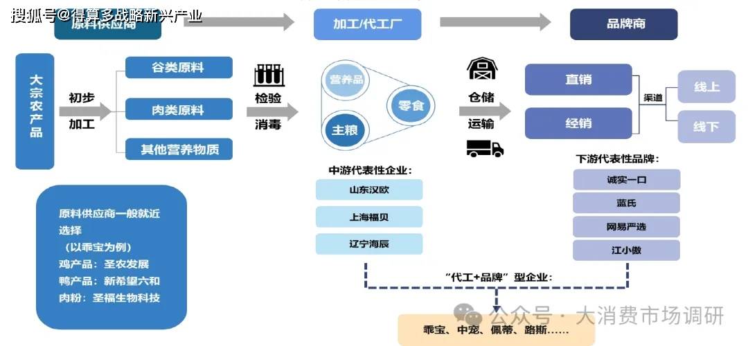 寵物食品產(chǎn)業(yè)鏈日趨完善,頭部品牌注重供應(yīng)鏈完整。產(chǎn)業(yè)鏈的上游為原料供應(yīng)商,中游為加工/代工廠,負(fù)責(zé)進(jìn)行原料精加工,下游為品牌商,通過(guò)線上/線下渠道、直銷/經(jīng)銷手段將產(chǎn)品出售給消費(fèi)者。