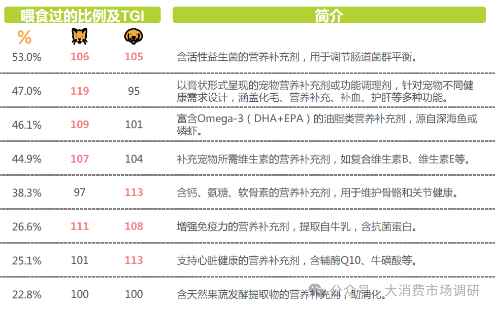 除了日常的主糧和零食,更多寵物主選擇給寵物喂食營養(yǎng)補(bǔ)充劑,為“毛孩子”提供全方位的健康呵護(hù)。益生菌以53.0%的比例位居營養(yǎng)補(bǔ)充劑喂養(yǎng)首位,寵物的腸道健康受到寵主的重點(diǎn)關(guān)注。貓主更偏好化毛膏/營養(yǎng)膏/補(bǔ)血膏等膏類營養(yǎng)補(bǔ)充劑,滿足貓咪潤滑腸道排毛球、增強(qiáng)體質(zhì)的需求。而狗主更偏好鈣片/氨糖等關(guān)節(jié)類、輔酶Q10等護(hù)心類營養(yǎng)補(bǔ)充劑,預(yù)防狗狗的骨質(zhì)疏松、心力衰竭等問題??傮w來看,寵物營養(yǎng)補(bǔ)充劑喂養(yǎng)正從“泛營養(yǎng)補(bǔ)充型”向“精準(zhǔn)功能型”升級。