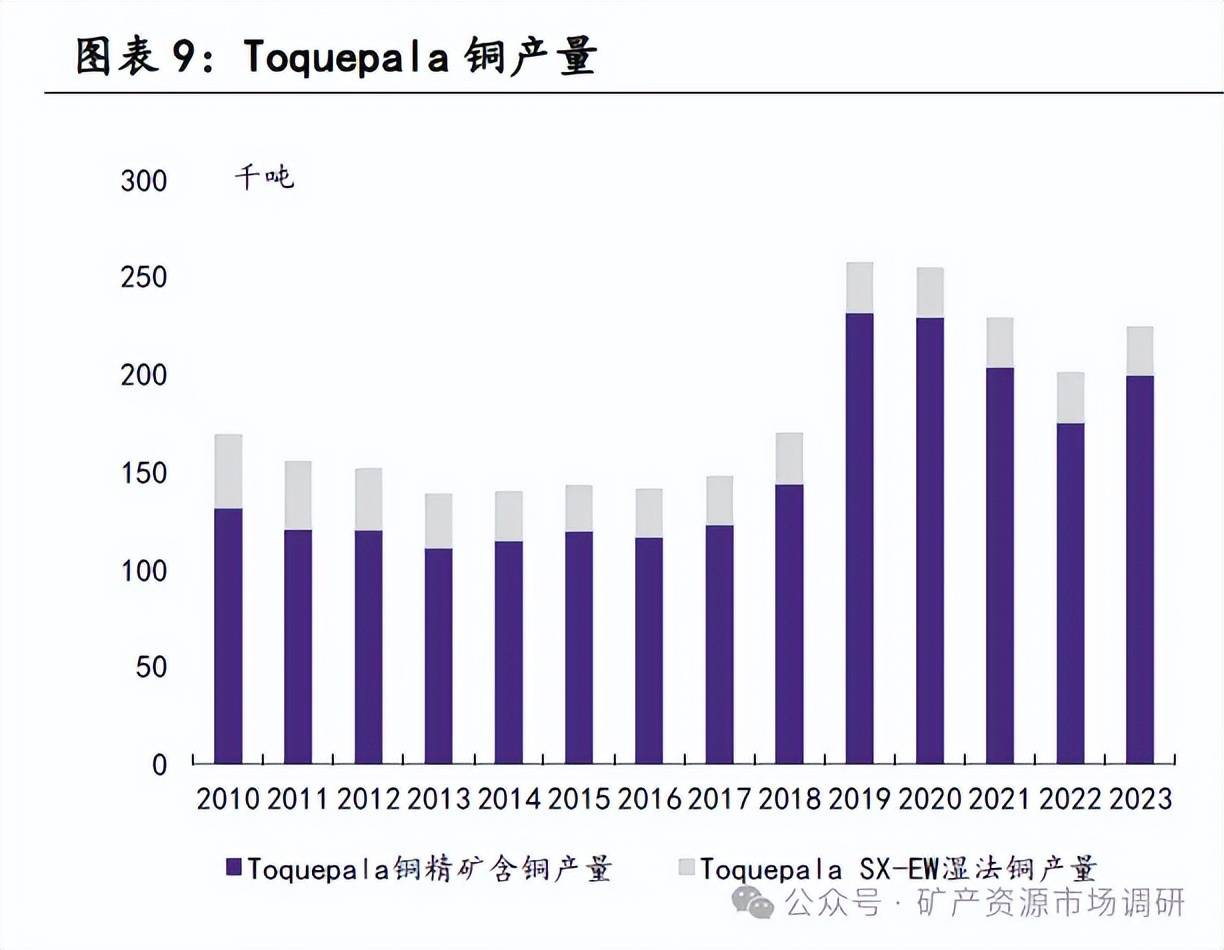 截止到2023年年底,Toquepala項(xiàng)目包括一個(gè)露天銅礦和兩個(gè)選礦廠,每個(gè)項(xiàng)目的碾磨能力為每天 60,000 噸。此外,Toquepala項(xiàng)目還包括一個(gè)SX-EW工廠,通過(guò)浸出工藝精煉銅。SX-EW工廠的年產(chǎn)能為5.64萬(wàn)噸LME A級(jí)陰極銅。2023年Toquepala項(xiàng)目合計(jì)產(chǎn)銅22.5萬(wàn)噸,產(chǎn)鉬金屬6300噸。