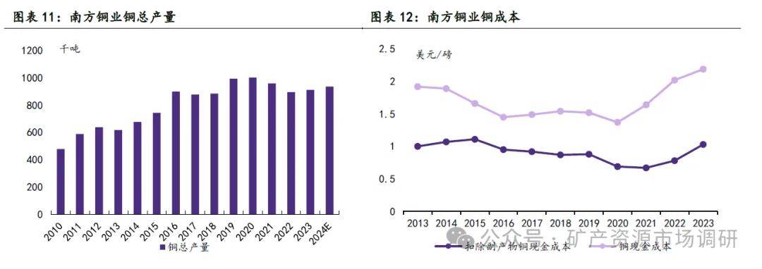 南方銅業(yè)2023年銅總產(chǎn)量為91.1萬(wàn)噸,且計(jì)劃2024年產(chǎn)銅93.59萬(wàn)噸。過(guò)去10年復(fù)合增速為3.97%。