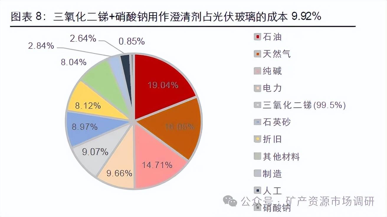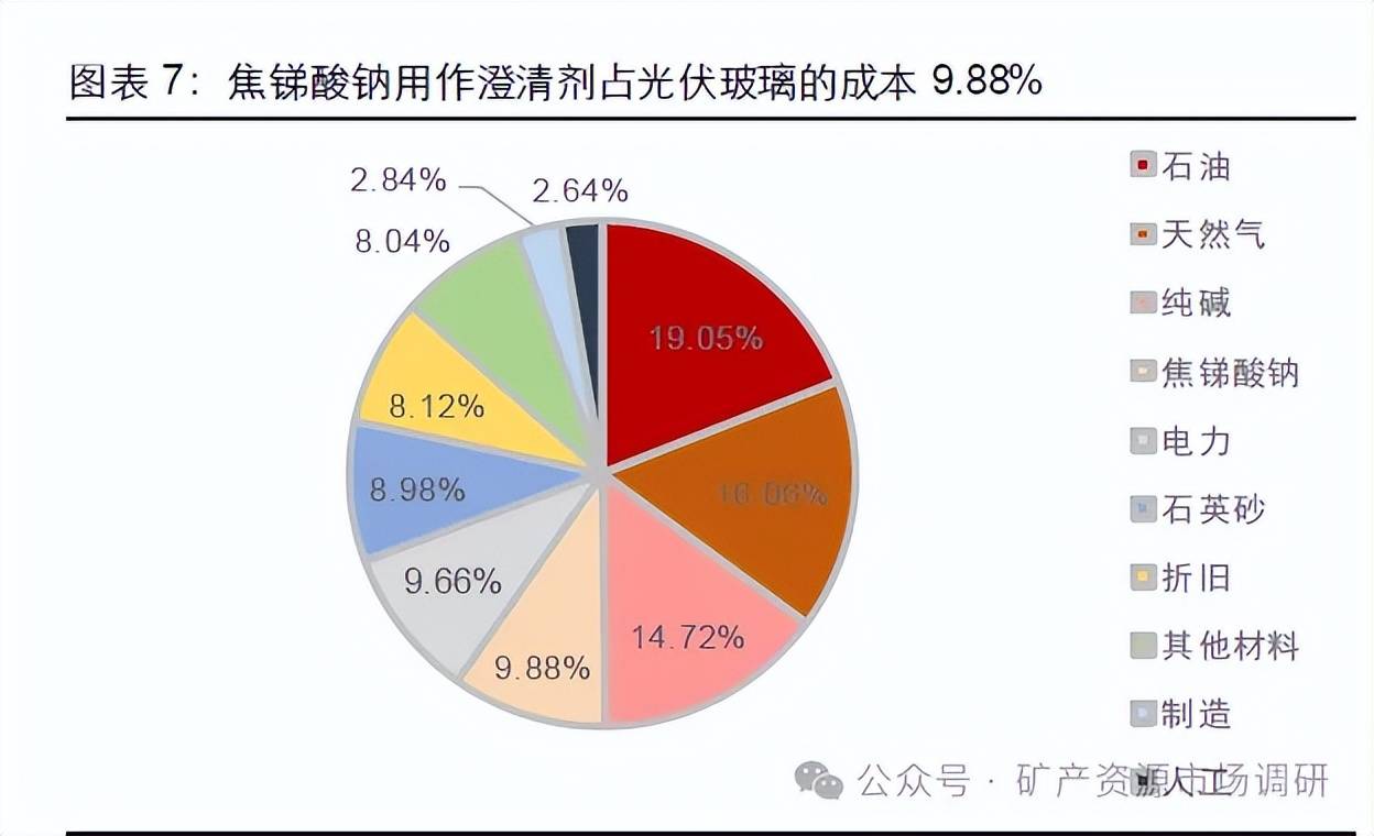 目前銻系澄清劑占光伏玻璃成本比重在10%左右 ,超越石英砂,在主材成本占比中僅次于純堿 。 基于百川 資訊 8月 9日報(bào)價(jià) 目前 焦銻酸鈉占光伏玻璃成本結(jié)構(gòu) 9.88%,氧化銻 +硝酸鈉合計(jì)占比 9.92%。