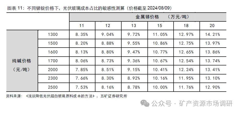 首先銻價(jià)上漲對光伏需求的影響估算下,預(yù)計(jì)銻錠漲至20萬 /噸,其將取代純堿成為主材成本第一大構(gòu)成。 假設(shè)純堿價(jià)格在 1500-2500元 /噸區(qū)間,銻錠價(jià)格在 11-20萬元 /噸價(jià)格區(qū)間