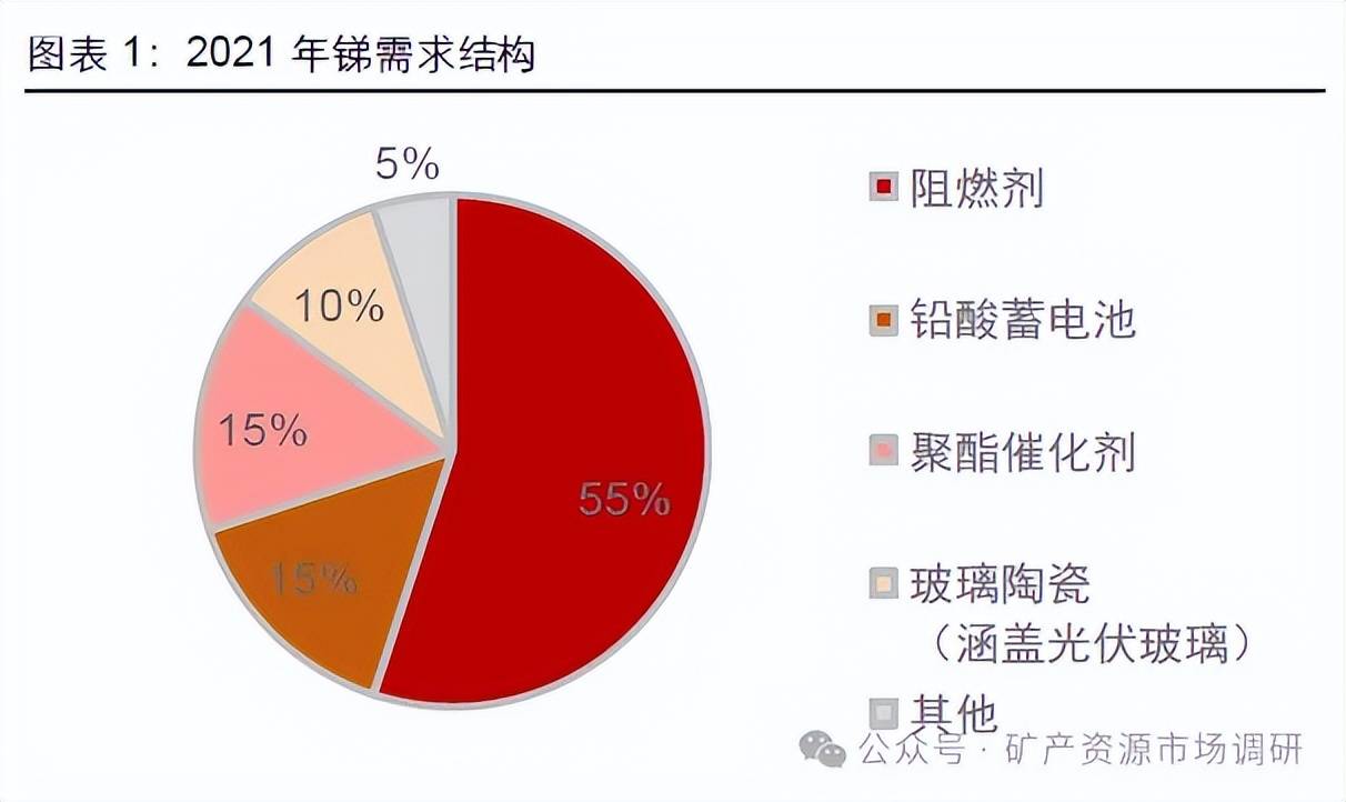 銻的下游應(yīng)用主要集中于阻燃劑、玻璃陶瓷、鉛酸蓄電池、聚酯催化和軍工等領(lǐng)域。其中,阻燃劑占比 55%,鉛酸電池占比 15%,聚酯催化占比 15%,玻璃陶瓷占比 10%,其它合計(jì)5%。