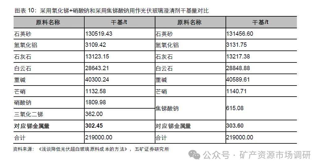 動前提下,使用三氧化二銻與硝酸鈉作為澄清劑與單獨(dú)使用焦銻酸鈉作為澄清劑 的測算。焦銻酸鈉方 案原料總成本每日可以節(jié)約 9536.6元 ,每年可節(jié)約 348.09萬元。焦銻酸鈉與三氧化二銻的方案橫向比較下,焦銻酸鈉的銻金屬單耗更小,轉(zhuǎn)換為三氧化銻并不會影響到銻需求總量。