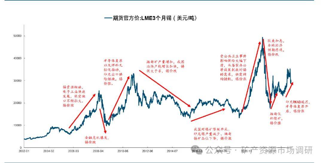 2023至今: 2023 年 1 月初秘魯圣拉斐爾錫礦停產(chǎn), 2023 年 4 月緬甸佤邦發(fā)布暫停一切礦產(chǎn)資源開采的通知,錫礦供 應(yīng)緊張; 24 年初印尼 RKAP 延后發(fā)放,在供應(yīng)預(yù)期顯著收縮大背景下,在消費(fèi)電子尚未顯著復(fù)蘇的情況下,錫價(jià)顯著上漲。