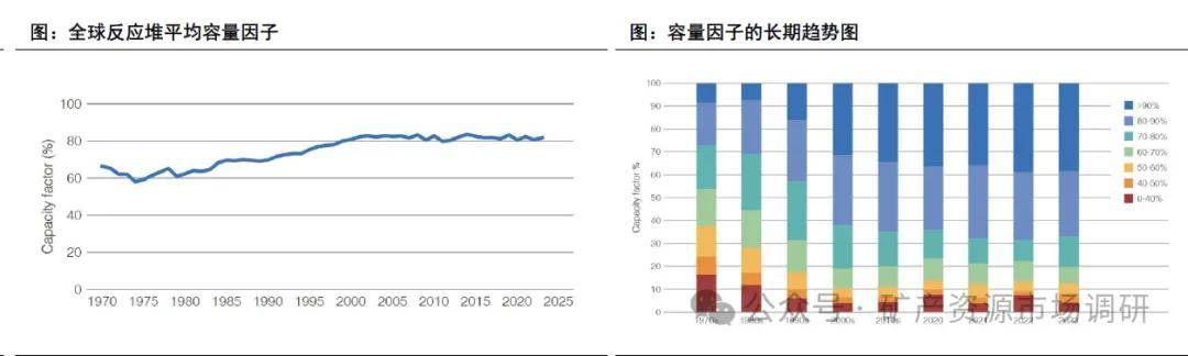 ? 全球核電站運(yùn)營(yíng)效率提升。容量因子表示核反應(yīng)堆的實(shí)際發(fā)電量與其最大可能發(fā)電量的比率,反映了核電站的實(shí)際運(yùn)行效率。2023年全球核反應(yīng)堆的平均容量因子為81.5%,高于2022年的80.4%。自2000年以來(lái),全球核電站的容量因子一直保持在較高水平,表明核電站的運(yùn)行效率持續(xù)較好。全球核電站的運(yùn)營(yíng)表現(xiàn)隨著技術(shù)進(jìn)步和運(yùn)維優(yōu)化穩(wěn)步提升,1970年代,全球核電站的平均容量因子約為60%左右,之后逐步上升,至1990年代達(dá)到80%左右,一直保持在較高水平,意味著核電站的設(shè)備利用率和發(fā)電效率處于相對(duì)穩(wěn)定和高效的狀態(tài)。