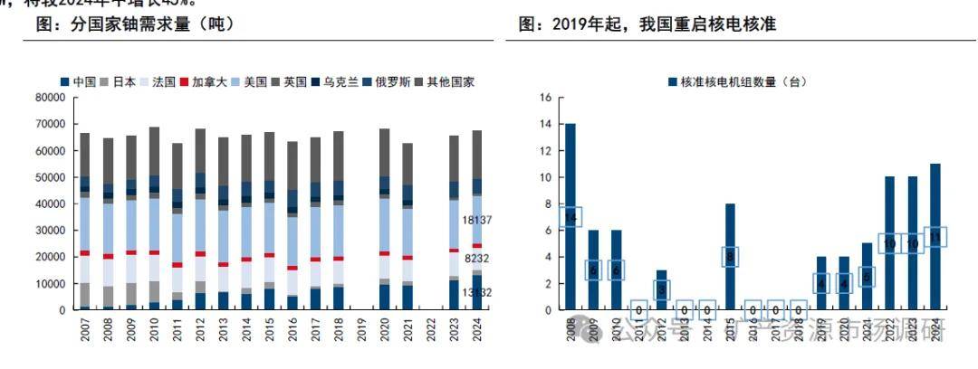 ? 從鈾需求量來(lái)看,根據(jù)世界核協(xié)會(huì)數(shù)據(jù)預(yù)測(cè),2024年全年鈾需求量為67517噸,2007年以來(lái)無(wú)明顯增量,近20年大部分年份需求量在6.4-6.8萬(wàn)噸之間。其中,美國(guó)核電需求量世界第一,2024年需求1.8萬(wàn)噸,中國(guó)作為第二大鈾需求國(guó),需求量為1.3萬(wàn)噸。