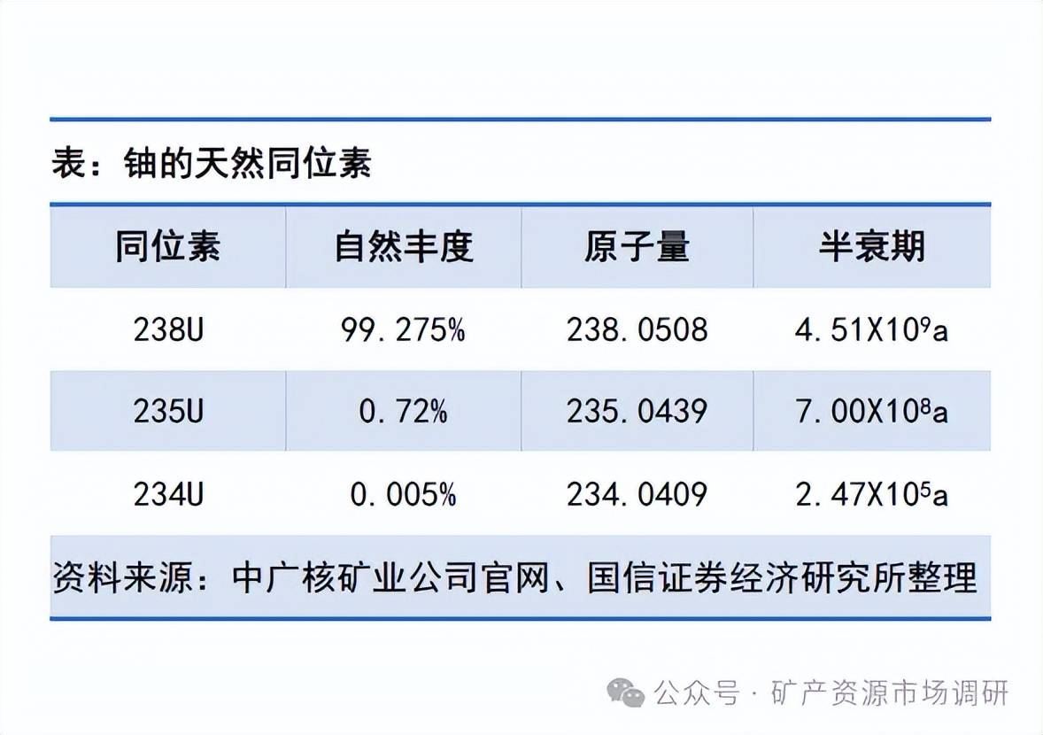 ? 天然鈾是生產(chǎn)濃縮鈾的原料,也可用于生產(chǎn)钚。鈾原子序數(shù)為92,原子量為238,是自然界中能夠找到的最重元素。自然界中存在三種鈾的同位素,分別是自然豐度為99.275%的鈾238、自然豐度為0.72%的鈾235和自然豐度為0.005%的鈾234,能用作核電燃料的是鈾235。