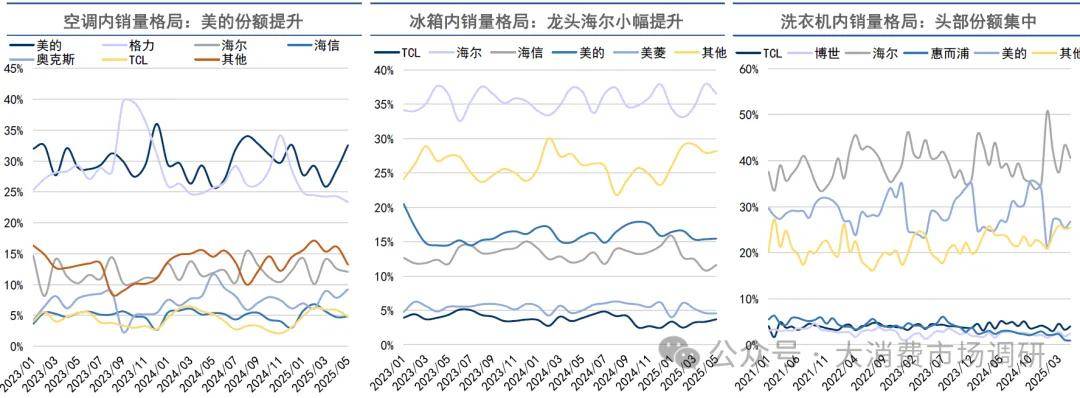 空調內銷:2025年1-5月,美的、海爾憑借齊全的價格帶及產品布局份額穩(wěn)步提升,行業(yè)CR3同比提升0.4pct;中腰部品牌份額小幅下降。