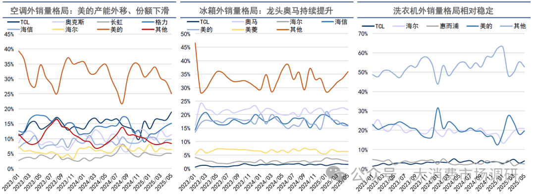 空調外銷:一超多強格局,受美的空調外銷產能轉移至海外影響,美的出口份額有所下降;中腰部品牌份額提升較多。