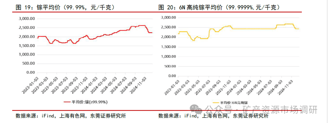 此外,鎵憑借著獨特的物理及化學(xué)性質(zhì),在半導(dǎo)體、工業(yè)、醫(yī)學(xué)、光學(xué)等領(lǐng)域發(fā)揮著不可或缺的作用,短時間沒有合適的替代品來替代鎵的作用。2024 年1-11 月國內(nèi)集成電路產(chǎn)量達到3953 億塊,已超過2023 年全年的產(chǎn)量;1-10 月份國內(nèi)光伏電池產(chǎn)量為54343 萬千瓦,已超過2023 年全年的54116 萬千瓦。短期來看,高位鎵價或使得部分下游消費企業(yè)的采購意愿退卻,但中長期隨著供需格局加速改善,且沒有現(xiàn)成替代物的作用下,預(yù)計鎵價在震蕩后將再度抬升。根據(jù)Fastmarkets,鎵價(99.99%)在12 月13日上漲至595 美元/千克,較12 月11 日上漲17%,為2011 年以來的新高。