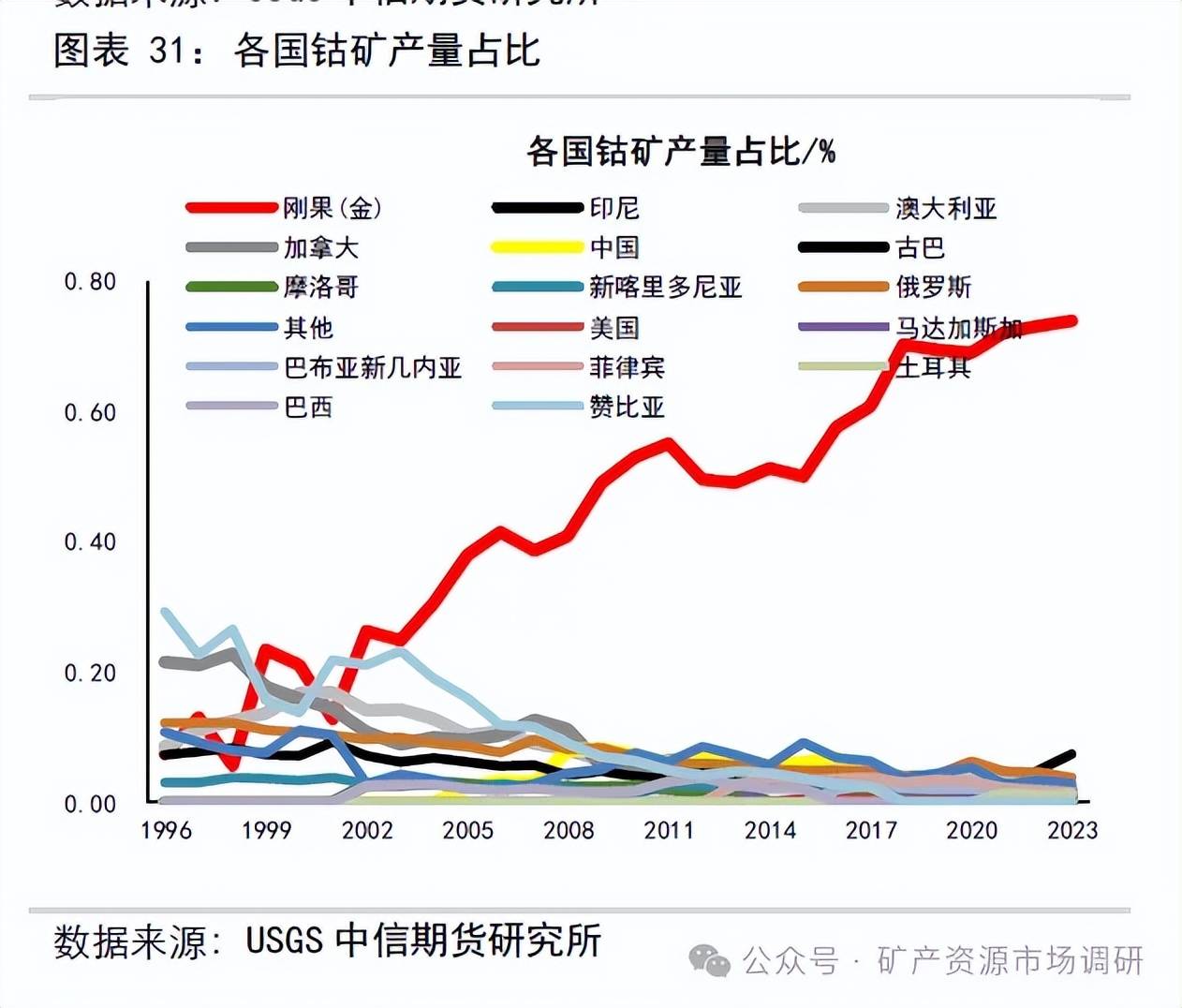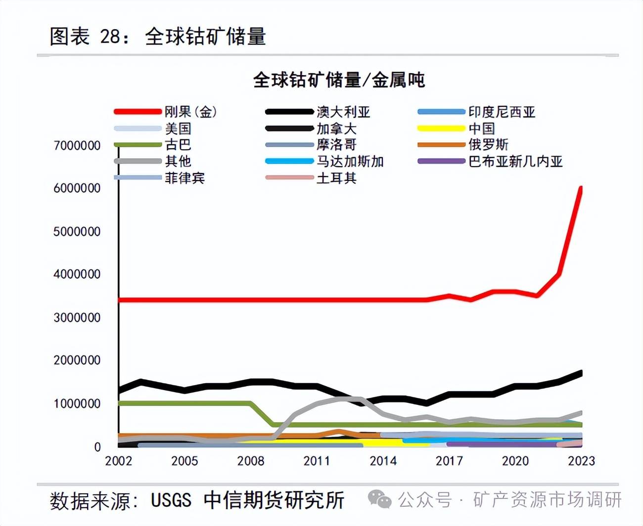 根據(jù)USGS 調(diào)查統(tǒng)計(jì),2023 年全球已探明鈷礦儲(chǔ)量1100 萬(wàn)金屬?lài)崳仍黾?2.5%。其中,非洲剛果(金)儲(chǔ)量600 萬(wàn)金屬?lài)?,占?4.5%;澳大利亞儲(chǔ)量170萬(wàn)金屬?lài)崳急?5.5%;印尼和古巴儲(chǔ)量均為50 萬(wàn)金屬?lài)?,占比均?.5%。2023 年全球鈷礦產(chǎn)量23 萬(wàn)金屬?lài)?,同比增?6.8%。其中,非洲剛果(金)產(chǎn)量17 萬(wàn)金屬?lài)?,占?4%;印尼產(chǎn)量1.7 萬(wàn)金屬?lài)?,占?%;俄羅斯產(chǎn)量0.88萬(wàn)金屬?lài)?,占?%。